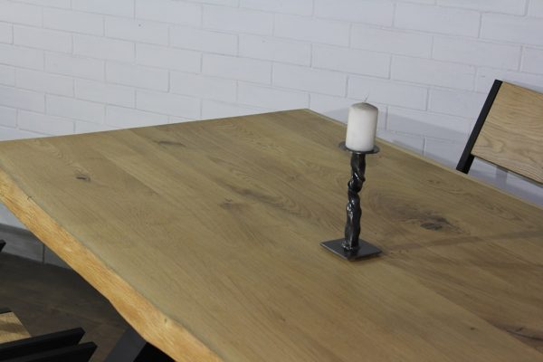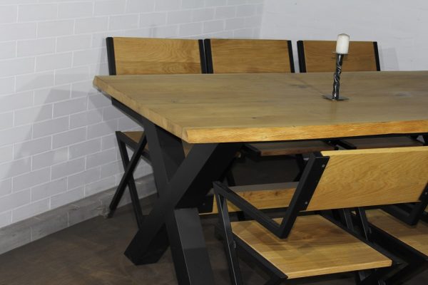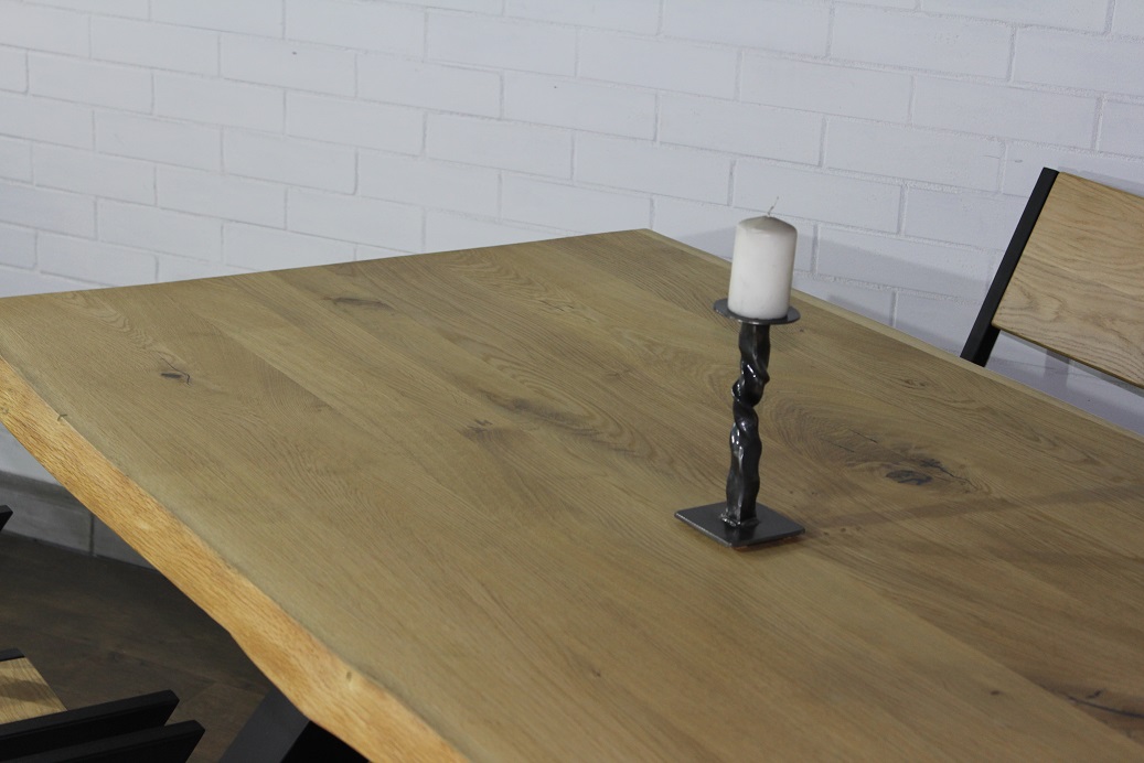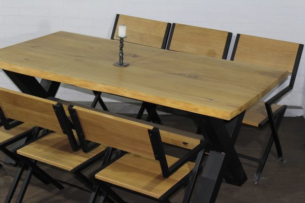 Состоит из стола и 6 стульев. Выполнено из натурального дуба и металла в полимерном покрытии. Толщина столешницы 40мм.