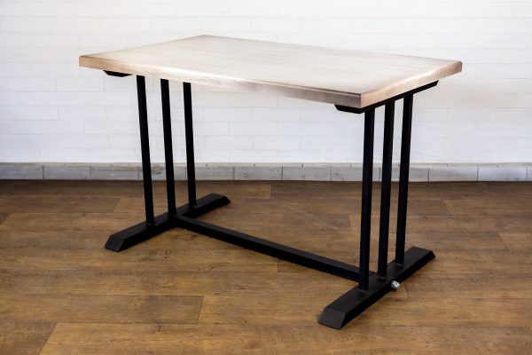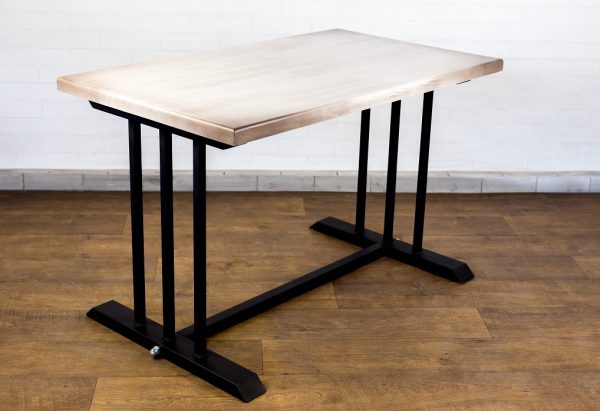 Материал столешницы — патинированная сосна, подстолье — металл в полимерном покрытии.
